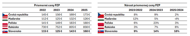 V nasledujúcich dvoch rokoch sa tempo rastu na Slovensku ešte zrýchlilo. V roku 2024 došlo k zvýšeniu priemerných cien nových PZP o takmer 14,5 % a v roku 2025 o viac než 17 %. Práve obdobie rokov 2024 a 2025 predstavuje z hľadiska dynamiky cien najvýraznejší posun na slovenskom trhu PZP v celej jeho histórii od demonopolizácie zákonného poistenia v roku 2002.